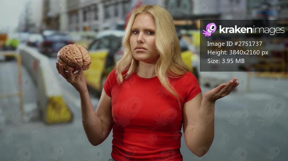 Woman holding brain in construction site, looking confused amidst busy city backdrop with traffic.