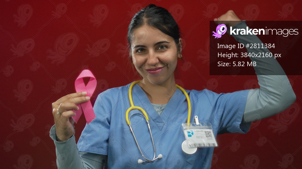 Woman holding bright pink breast cancer ribbon and flexing arm in studio; empowerment solidarity hope.