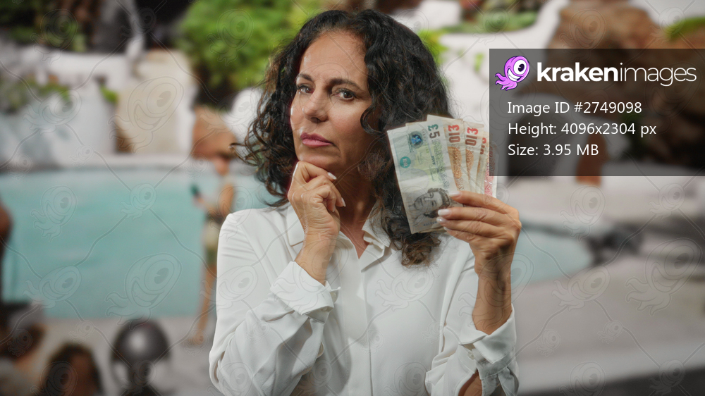 Woman holding british banknotes outdoors at a resort pool, pondering financial decisions amidst a scenic hotel backdrop, highlighting travel expenses and currency. - Kraken Images