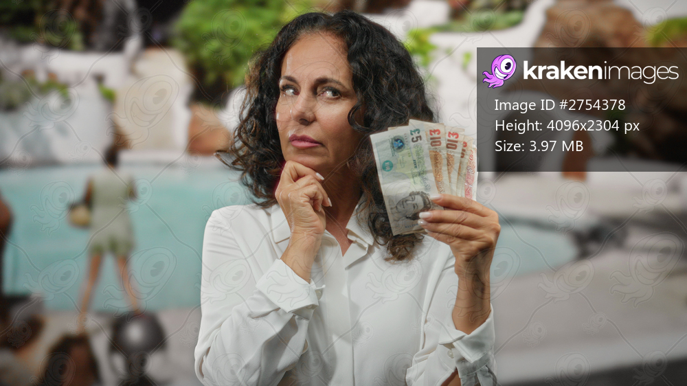 Woman holding british banknotes outdoors at a resort pool, pondering financial decisions amidst a scenic hotel backdrop, highlighting travel expenses and currency. - Kraken Images