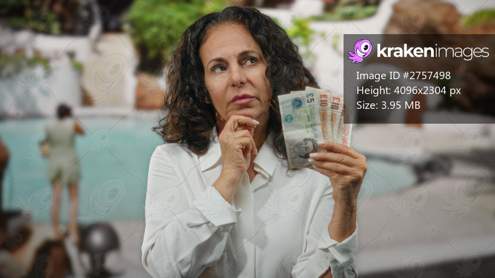Woman holding british banknotes outdoors at a resort pool, pondering financial decisions amidst a scenic hotel backdrop, highlighting travel expenses and currency. - Kraken Images