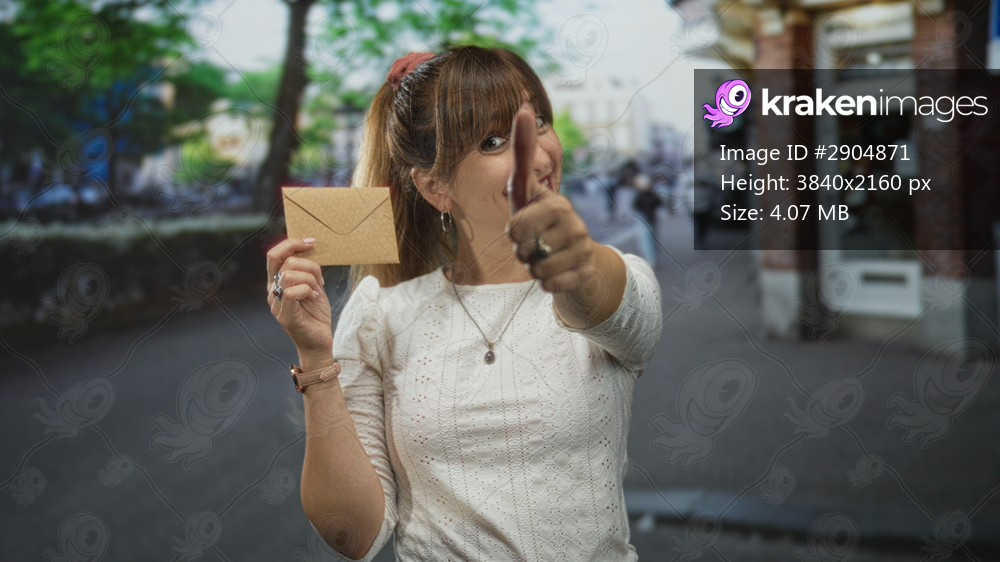 Woman holding brown envelope showing thumbs down gesture on city street with blurred trees and storefronts visible; disappointment.