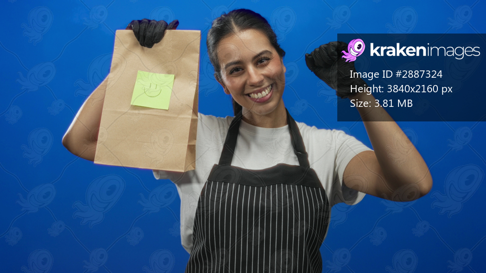 Woman holding brown paper bag with smile and raised arm in blue studio, wearing apron and black gloves; friendly takeout happy.