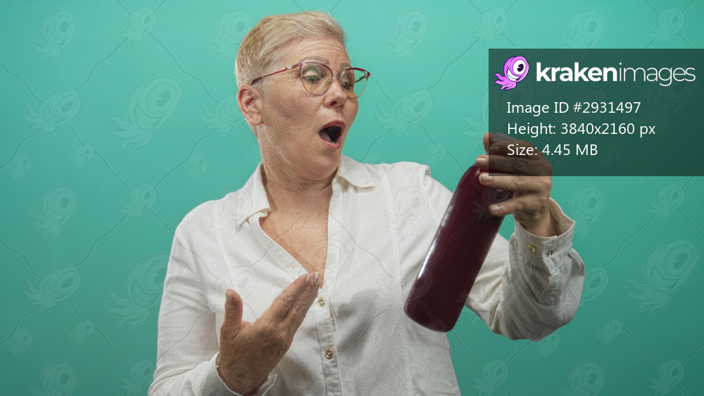 Woman holding burgundy bottle in turquoise studio inspecting a label with a surprised expression; product curiosity surprise.