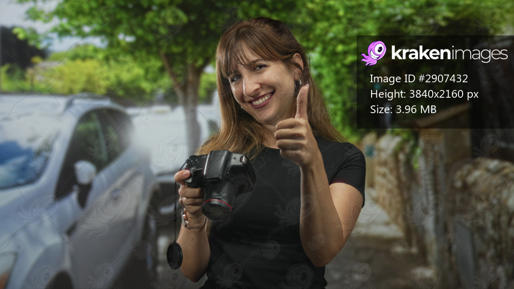 Woman holding camera and checking settings while giving thumbs up on a sunny street beside a parked white car and stone wall; happiness travel memory.