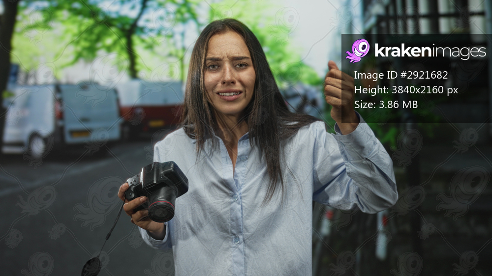 Woman holding camera with clenched fist and pointing gesture on street beside parked vans, face contorted in distress; frustration determination.
