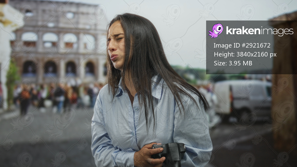 Woman holding camera clutching lower back with visible backache on street by the roman colosseum building; discomfort travel fatigue.