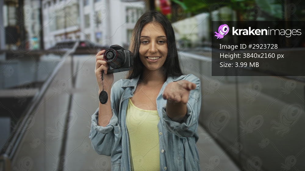 Woman holding camera with hand extended palm up on city street, smiling and offering lens; inviting moment.