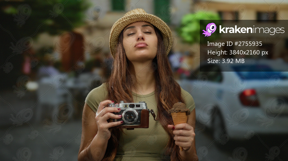 Woman holding camera and ice cream on a bustling street, enjoying travel moments wearing straw hat under sunny skies, expressing wanderlust and hispanic cultural essence. - Kraken Images