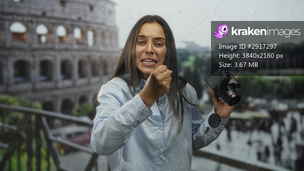 Woman holding camera with lens cap dangling, clenched fist near face, wearing blue shirt on coliseum building balcony with blurred crowd behind; travel frustration. - Kraken Images