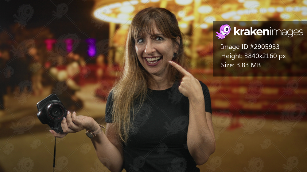 Woman holding camera points finger to cheek at a night street fair, smiling with teeth visible; joy celebration.