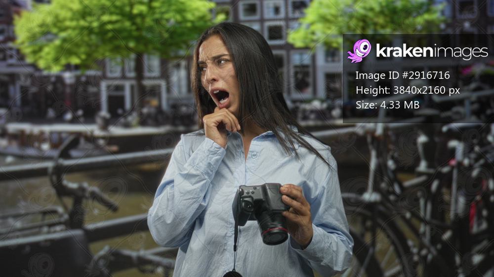 Woman holding camera and pulling at shirt while grimacing on street in amsterdam canal area; discomfort travel fatigue.