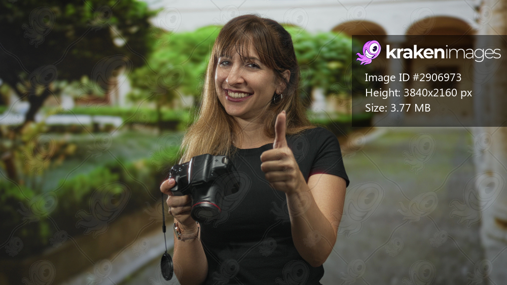 Woman holding camera showing thumbs up in courtyard with arches and greenery; travel exploration joy.