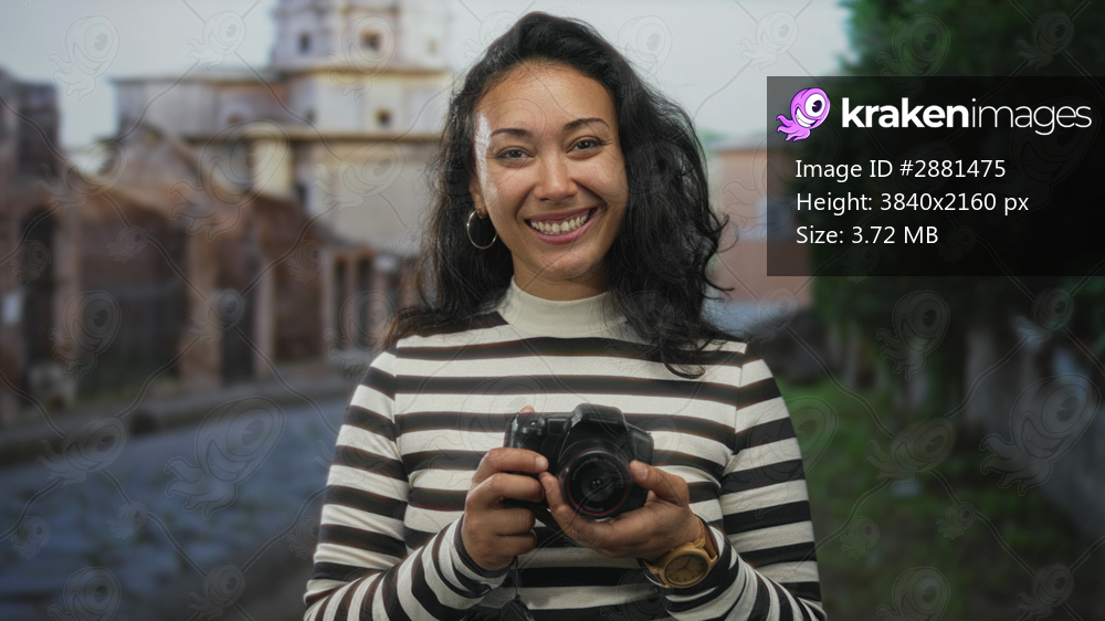 Woman holding camera and smiling, striped sweater and hoop earrings visible, standing on cobblestone street by historic building and trees; joy curiosity. - Kraken Images