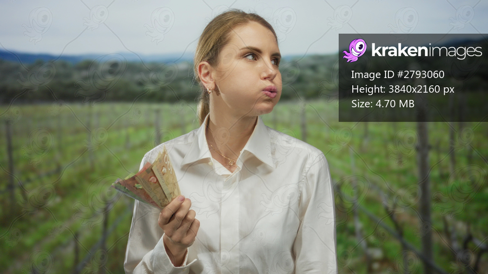 Woman holding canadian dollars in outdoor park setting with green landscape, wearing white shirt, expressing satisfaction, blonde hair blowing, natural light highlighting her features. - Kraken Images