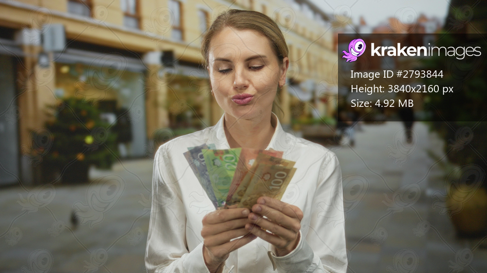Woman holding canadian dollars on a city street, showcasing blonde hair and a white shirt in an outdoor urban setting with a festive backdrop.