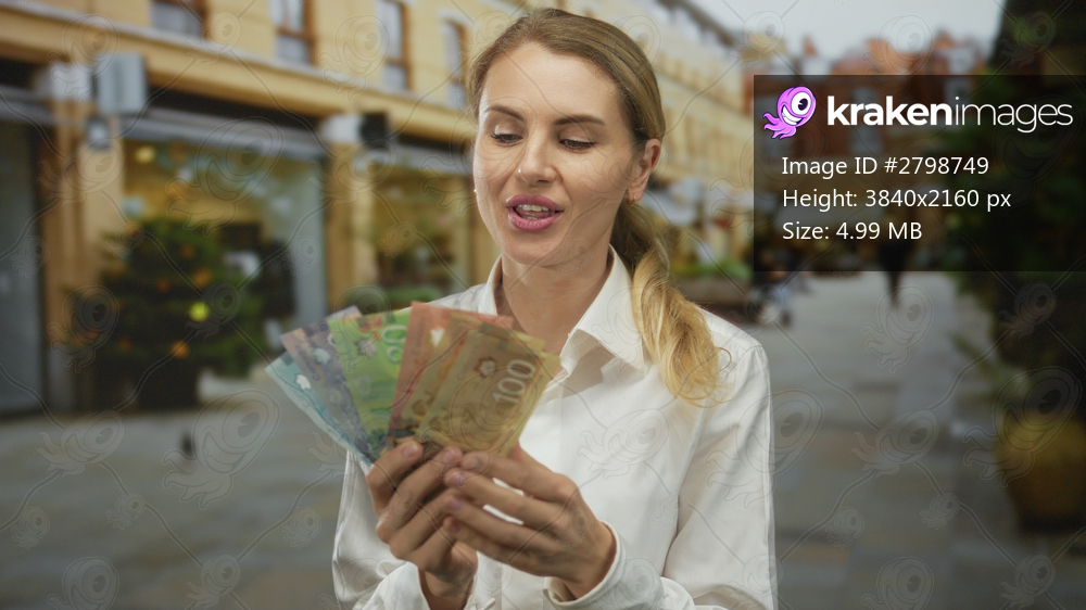 Woman holding canadian dollars on a city street, showcasing blonde hair and a white shirt in an outdoor urban setting with a festive backdrop.