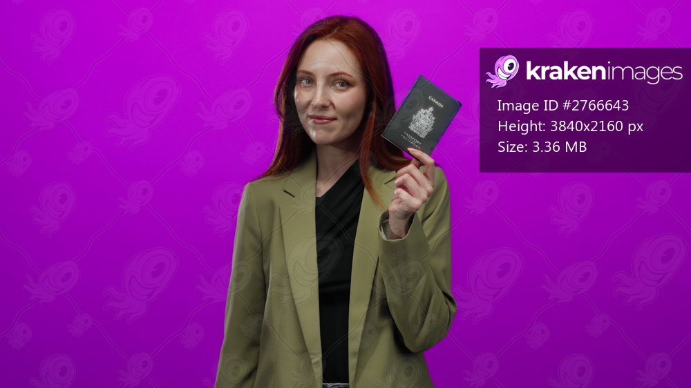 Woman holding canadian passport against vivid pink background showcasing identity and travel concept with smiling expression and professional attire.