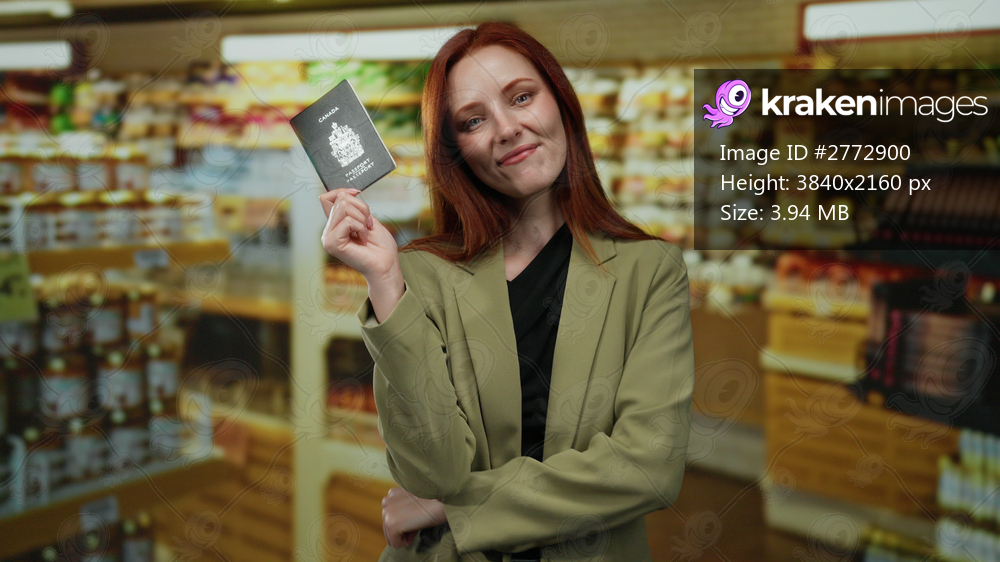 Woman holding canadian passport smiling confidently in supermarket background showing travel identification highlighting adult female traveler with red hair indoors