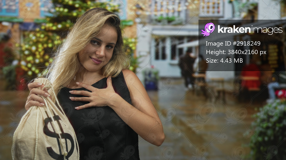 Woman holding canvas money bag with dollar sign, hand on chest, slight smile, wearing black dress while posing on street; confidence wealth gratitude.