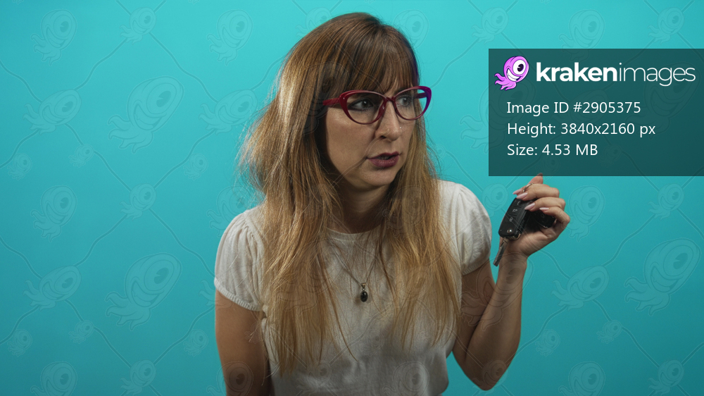 Woman holding car key by shoulder wearing red glasses in turquoise studio with white tee and long hair; skepticism.