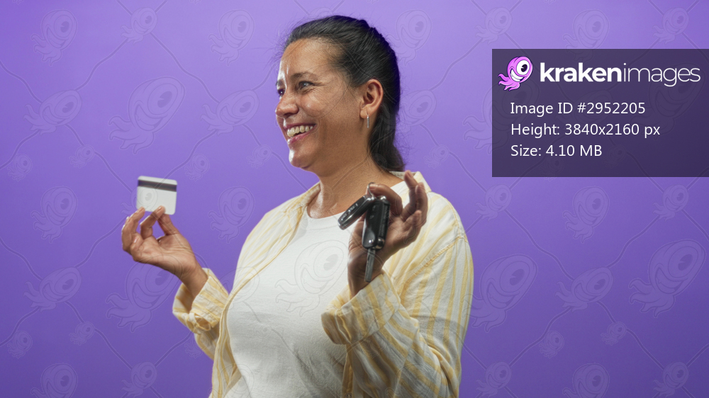 Woman holding car keys and a ticket card, smiling with hands raised in a purple studio setting, side profile in a casual striped shirt; happiness convenience trust. - Kraken Images