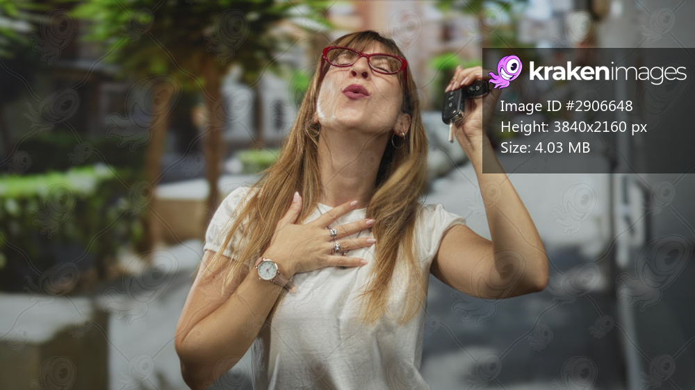 Woman holding car keys aloft on street with raised hand and visible watch and necklace, smiling in candid pose; joy celebration.