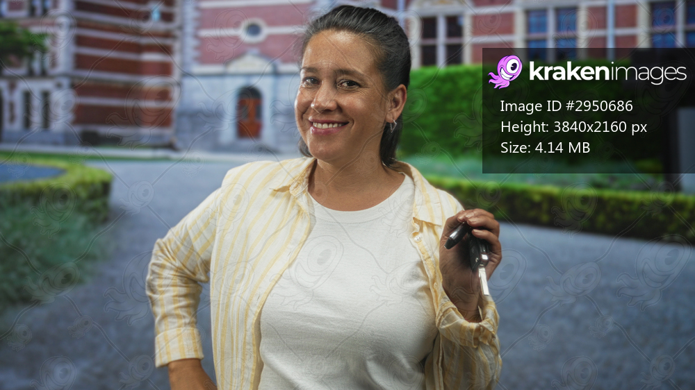 Woman holding car keys with hand raised and smiling, wearing striped shirt, standing outside a building entrance lined with hedge and path; new home confidence. - Kraken Images