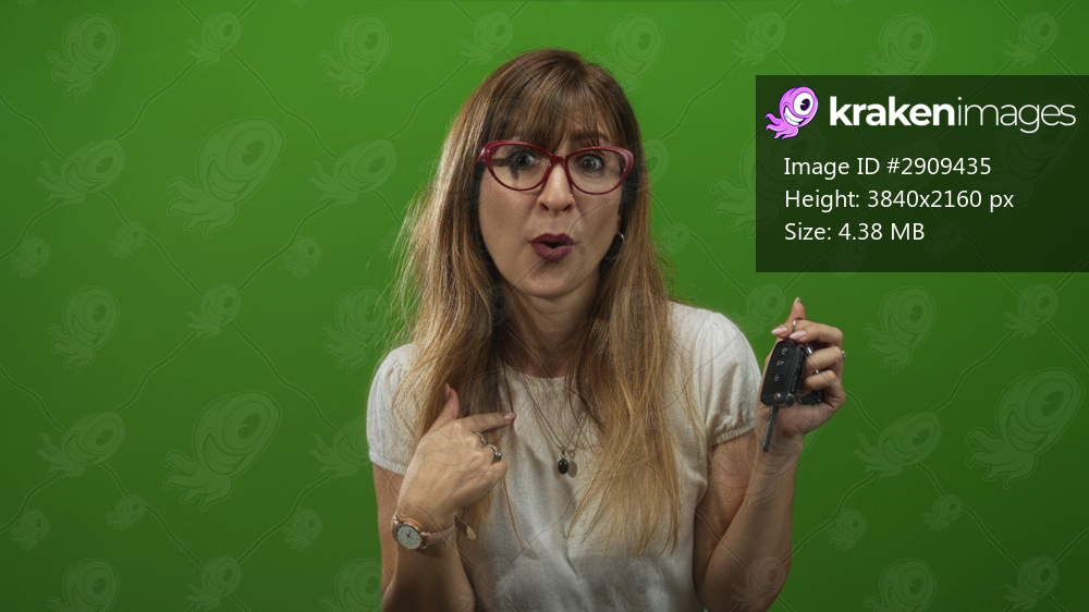 Woman holding car keys and pointing finger to chest while wearing red glasses and white shirt in green studio; surprise identity.