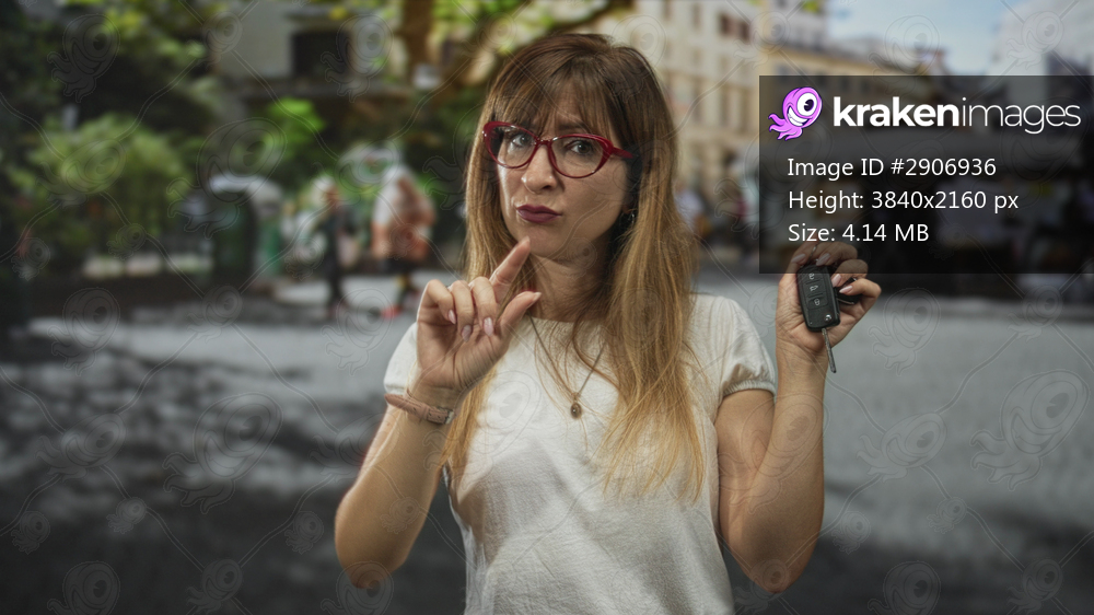 Woman holding car keys and points finger while standing on a busy cobblestone city street market with red glasses and white tee; playful skepticism.