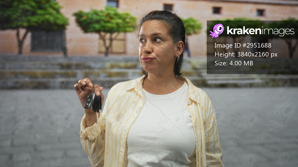 Woman holding car keys and rolling eyes with a dismissive shrug on a stone street by building steps; everyday annoyance.