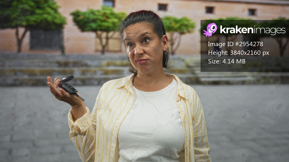 Woman holding car keys and rolling eyes with a dismissive shrug on a stone street by building steps; everyday annoyance.