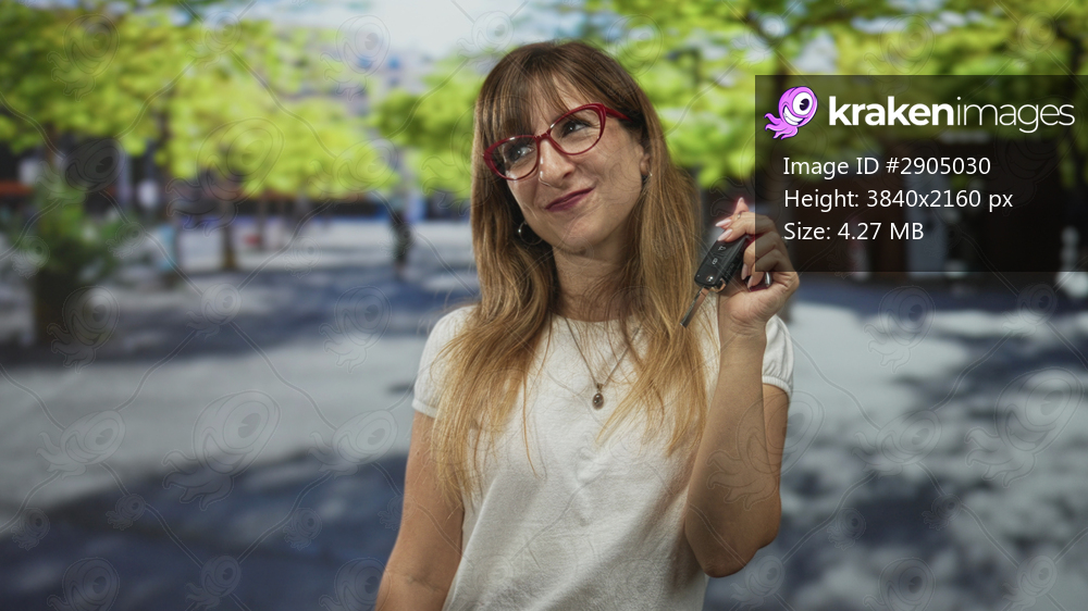 Woman holding car keys and smiling on a sunny street plaza; confidence independence ownership freedom.
