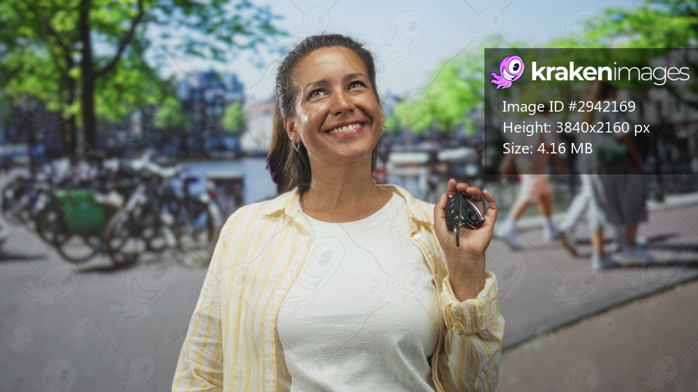 Woman holding car keys and smiling on street canal with parked bicycles, wearing striped yellow shirt over white tee, facing camera and posing; joy.