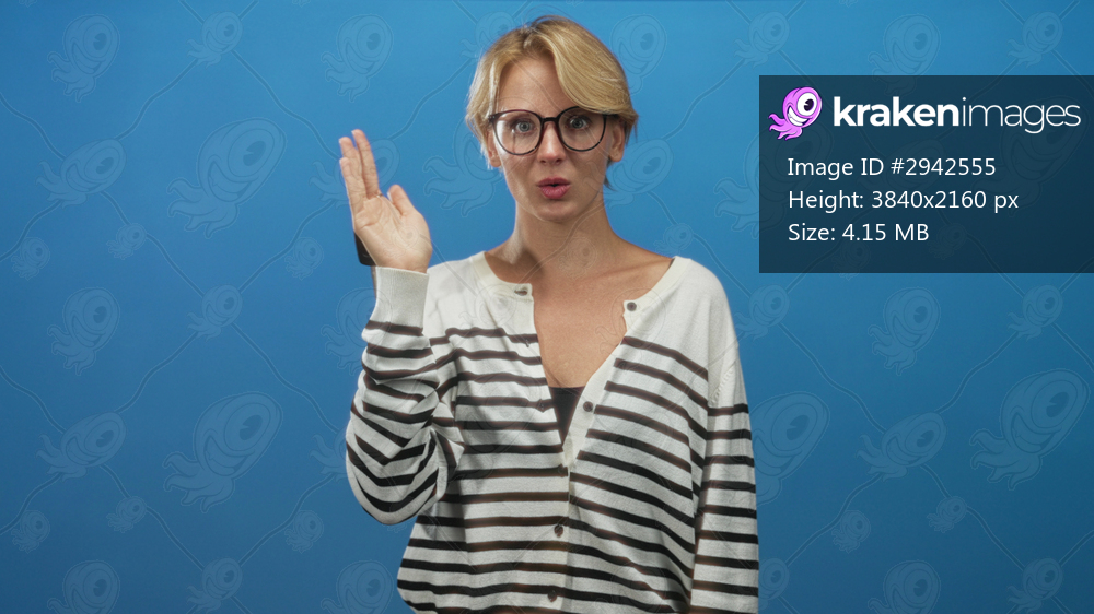 Woman holding car keys to her ear with hand cupped, wearing glasses and striped sweater in studio; curiosity.