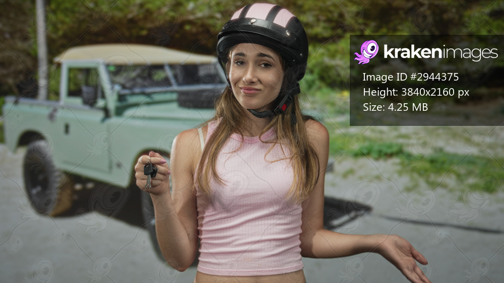 Woman holding car keys and wearing pink helmet and tanktop in forest beside a parked jeep with a half shrug and raised eyebrows; mild resignation.