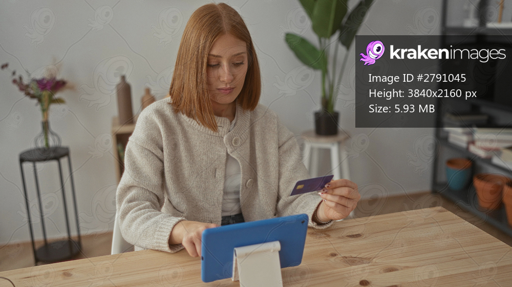 Woman holding card in cozy room with tablet at desk while shopping online showing modern lifestyle at home