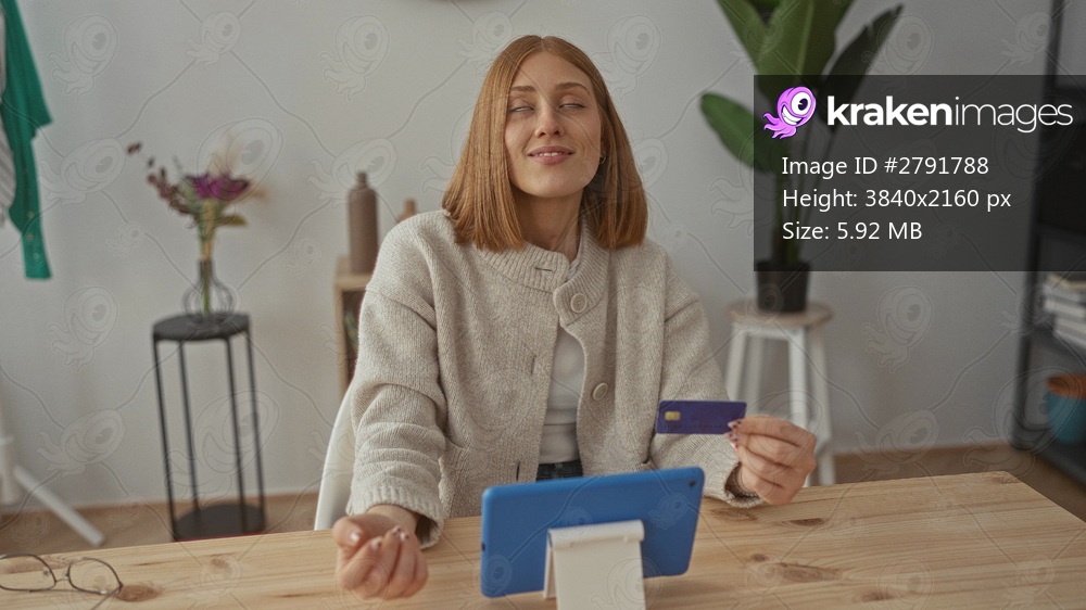 Woman holding card in cozy room with tablet at desk while shopping online showing modern lifestyle at home