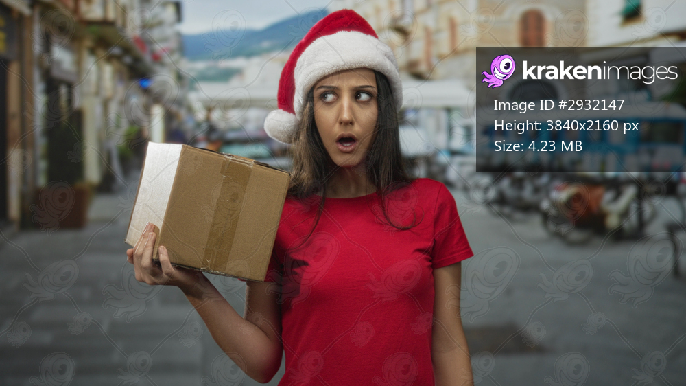 Woman holding cardboard package and pointing finger on street wearing santa hat and red shirt; holiday surprise.