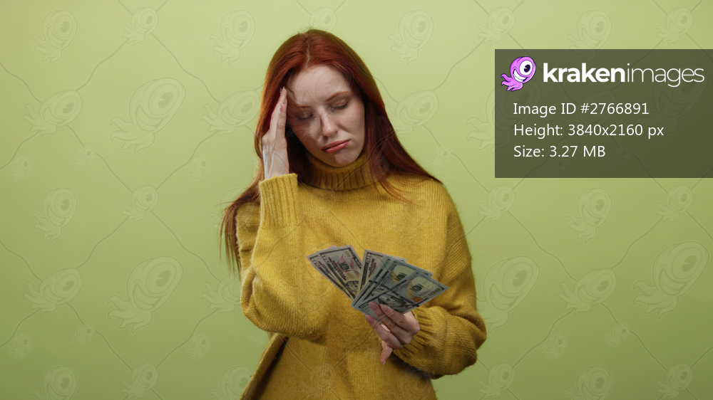 Woman holding cash with a worried expression against a yellow background, showcasing a financial or emotional dilemma.