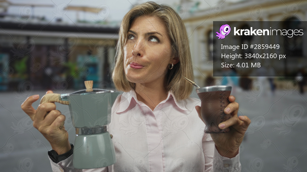 Woman holding ceramic moka pot and leather mate cup of hot brew on bustling colorful street; indecision.