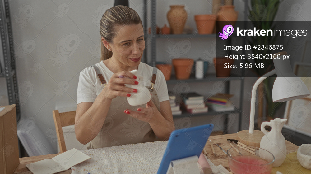 Woman holding ceramic vase with both hands and examining pottery tools at worktable in studio; creativity.