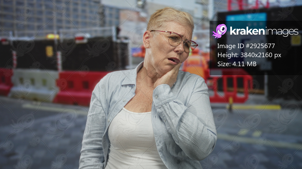 Woman holding cheek with hand for toothache on urban street by construction barriers and traffic cones, wearing glasses and light shirt; pain.