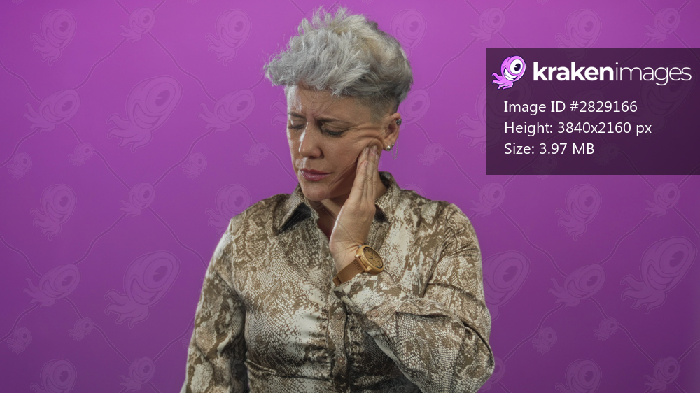 Woman holding cheek and wincing in a purple studio setting wearing patterned blouse; toothache discomfort.