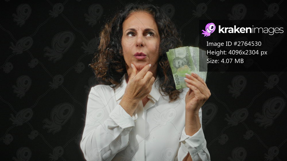 Woman holding chilean peso banknotes over black background, expressing thoughtful contemplation in financial context, highlighting middle-aged concerns about money and decision-making. - Kraken Images