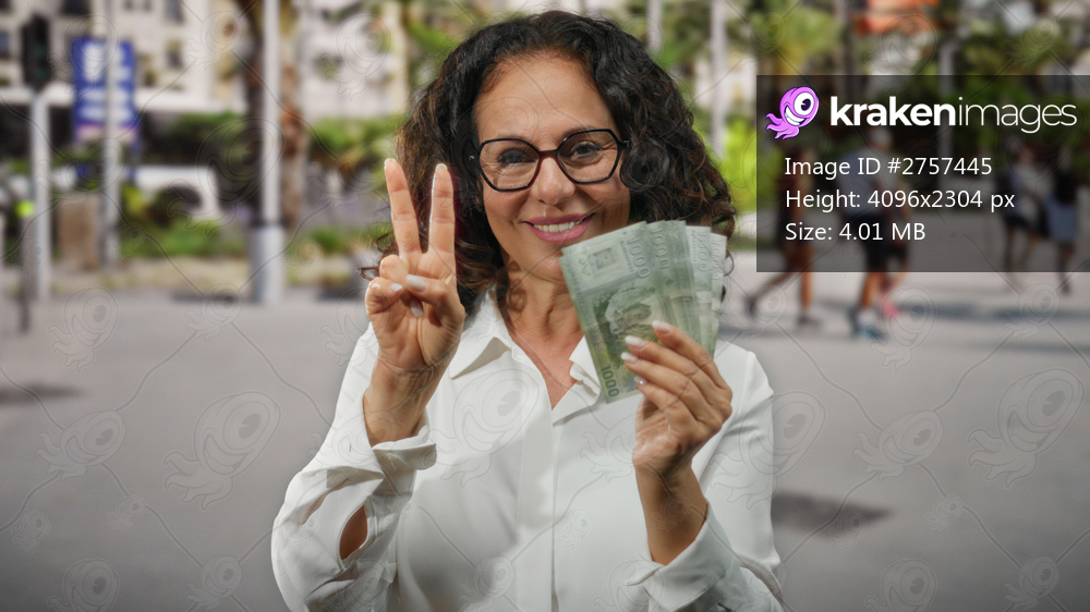 Woman holding chilean pesos in a city street, depicting outdoor urban setting, middle-aged with glasses, smiling and making a peace sign, suggesting financial success. - Kraken Images
