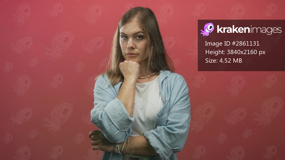 Woman holding chin with hand in red studio wearing denim shirt and white top, serious gaze at camera; doubt reflection.