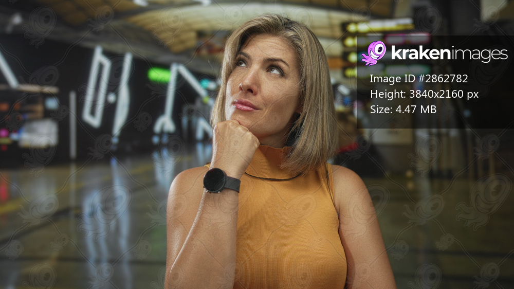 Woman holding chin thoughtfully with watchful gaze near departure gates at airport terminal; contemplation.