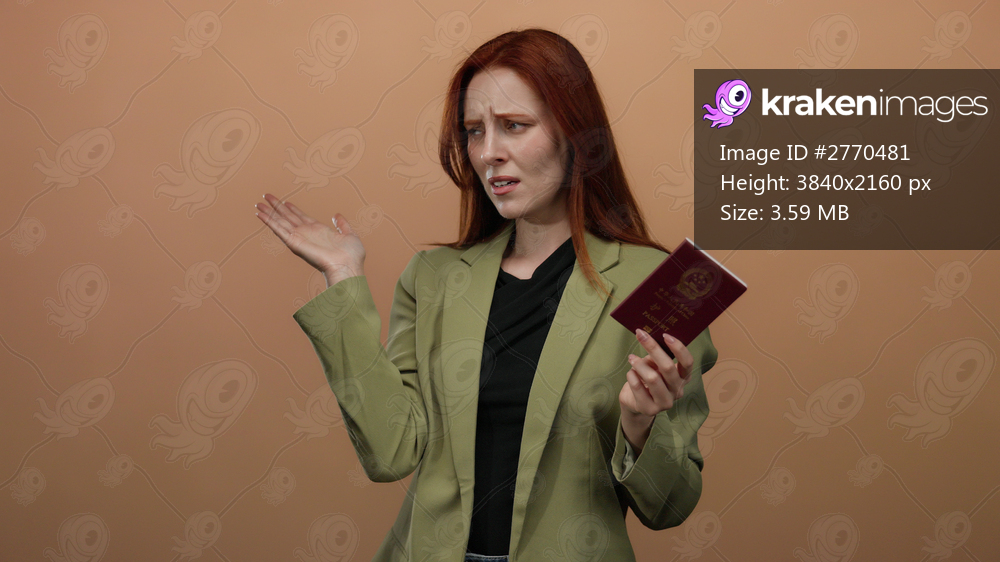 Woman holding chinese passport reacts to unpleasant smell with a disgusted expression against a plain brown wall.
