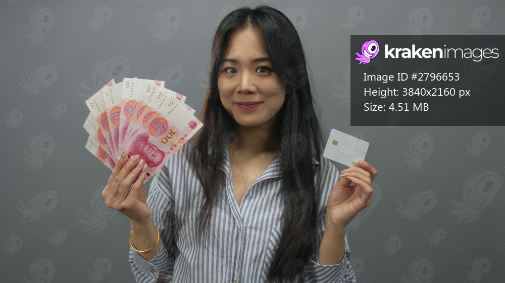 Woman holding chinese yuan banknotes and a credit card against an isolated grey background, showcasing financial prosperity and modern banking concepts. - Kraken Images